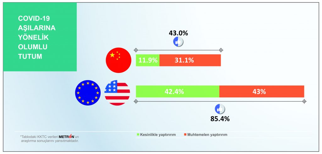 Çin aşısının uygulandığı Türkiye’de son dönemde yapılan çeşitli kamuoyu araştırmalarında aşı olabileceğini belirtenlerin oranı yüzde 44 düzeyinde saptanırken; METRON’un araştırmasında KKTC’deki yüzde 43 oranın buna oldukça yakın olduğu görülüyor. Araştırmalara göre bu oran Çin’de yüzde 80 düzeyinde seyrediyor.