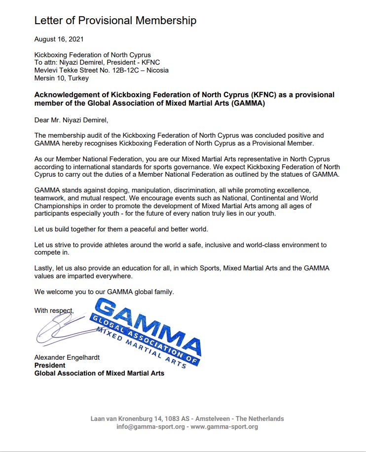 KKTC Kickboks Federasyonu, uzun süredir Türkiye MMA (Mixed Martial Arts) Fedearsyonu’nun da desteği ile yürüttüğü girişimler sonucunda, GAMMA (Global Association Of Mixed Martial Arts) Federasyonu’na yaptığımız üyelik başvurusu kabul ederek üyelikleri resmen onaylandı.