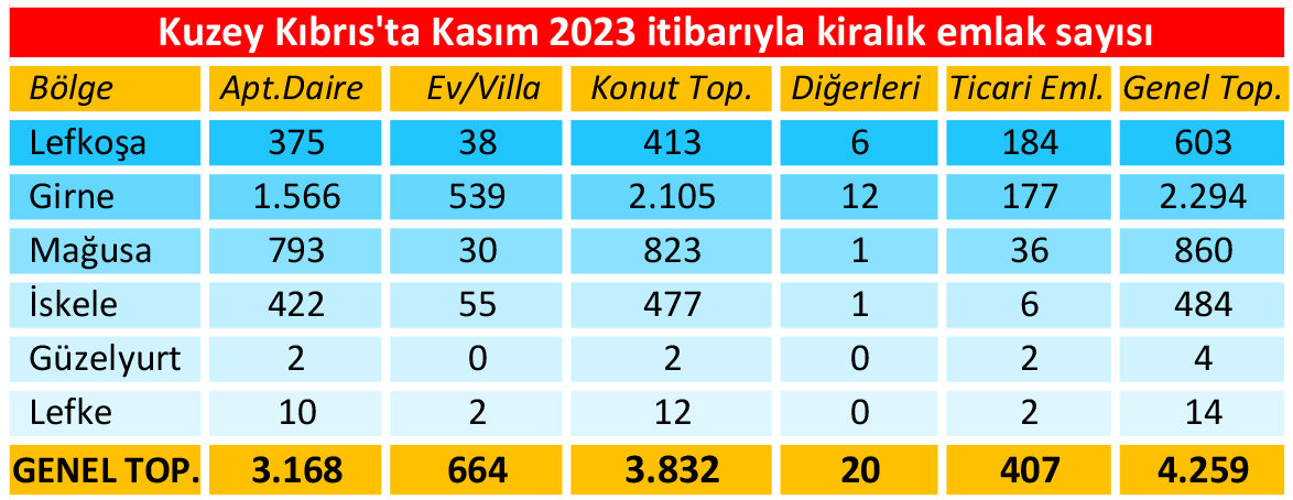 Ekim ayı sonunda 3 bin 930 olan kiralık emlak sayısı Kasım sonunda 4 bin 259’a çıktı