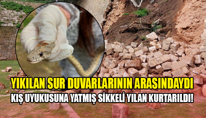 Kış uykusuna yatan sikkeli yılanı yıkılan tarihi surlar içinden kurtarıldı