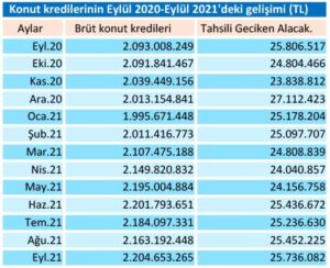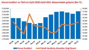 SORUNLU KREDİLER YILLIK BAZDA AZALDI… Konut Kredilerinde tahsili gecikmiş alacaklar (TGA-Sorunlu borçlar) ise Eylül ayında %1.12 oranında artış yaşamasına rağmen, yıllık bazda %0.27 oranında geriledi. Haziran 2020’de 28,5 milyon TL’yi aşarak tüm zamanların en yüksek noktasına ulaşan mahkemelik borçlar, yılı 27,1 milyon TL ile kapatmıştı. Ocak’ta 25,1 milyon, Şubat’ta 25 milyon, Mart’ta 24,8 milyon, Nisan’da 24 milyon TL’ye kadar inen TGA, Mayıs’ı 24,1, Haziran’ı 25,4, Temmuz’u 25,3 ve Ağustos’u da 25,4 milyonla geçmişti. TGA Eylül’de 25 milyar 736 milyon TL ile 2021’in en yüksek noktasına çıktı.