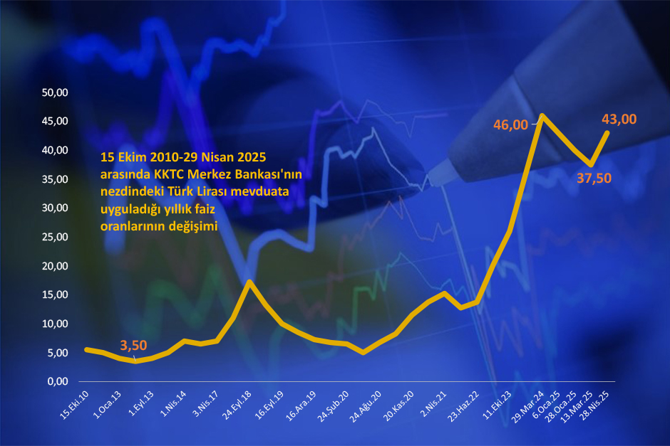 Kuzey Kıbrıs Türk Cumhuriyeti Merkez Bankası (KKTCMB) Yönetim Kurulu, nezdindeki Türk Lirası mevduat hesaplarına uygulanan faiz oranı ile Türk Lirası reeskont iskonto ve avans işlemleri yıllık faiz oranlarını yeniden belirledi. Faizlere “550” baz puanlık (%5.50) bir artış getirildi. KKTCMB’den yapılan duyuruda, vadelerinden bağımsız olmak kaydıyla, Merkez Bankası nezdindeki faize tabi Türk Lirası mevduat hesaplarına uygulanan faiz oranı yıllık %37.50’den %43.00’e yükseltildi.
