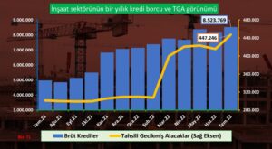 MAHKEMELİK BORÇLAR SERT ARTTI… GIYNIK Property’nin KKTC Merkez Bankası Risk Merkezi’nden sağladığı verilere göre, inşaat sektöründe krediler hızlı bir artış trendi izlerken, sektörün “Tahsili Gecikmiş Alacakları” (TGA- sorunlu borçlar) Mart ayında başladığı dalgalı bir seyri sonlandırdı. Temmuz’da sert artış gösteren TGA tüm zamanların en yüksek noktası olan 447 milyon 246 bin TL’ye çıktı. Temmuz 2021’de 301 milyon 347 bin TL olan sorunlu borçlar, yıllık bazda %48.42 oranında, aylık bazda %7.63 oranında, 2022 yılı içinde de %44.54 oranında artış gösterdi. TGA Mart’ta 399,6 milyon, Nisan’da 420,8 milyon, Mayıs’ta 423,1 milyon ve Haziran’da da 415,5 milyon TL olarak kaydedilmişti. Geçen yılın Temmuz’unda TGA’nın brüt krediler içindeki payı %6.06 oranında iken, bu yıl Brüt kredi/TGA %5.25’e kadar indi.