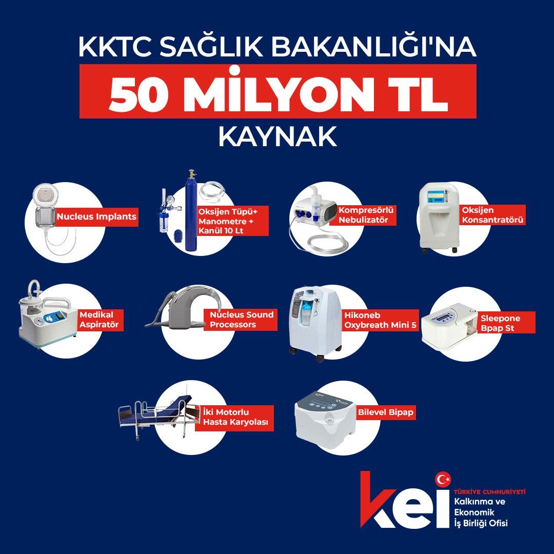 KKTC Sağlık Bakanlığı ve Türkiye Cumhuriyeti Lefkoşa Büyükelçiliği Kalkınma ve Ekonomik İş Birliği (KEİ) Ofisi tarafından yürütülen “İlaç ve Tıbbi Malzeme Alımı Projesi” kapsamında, onkoloji, MS, epilepsi, organ nakli tedavilerinde kullanılmak üzere hastaların elzem ilaç ihtiyaçları için oluşan mükellefiyetlerin karşılanması ve yıl sonuna kadar tedariklerinin sağlanması için 29,5 milyon TL, kurul kararı ile ilaç verilen hastaların geri ödemeleri için 500 bin TL, Yataklı Tedavi Kurumları Dairesi’ne bağlı hastanelerdeki KVC ve Kardiyoloji, Girişimsel Radyoloji, Beyin Cerrahi, Ortopedi ve Travmatoloji tedavilerinde kullanılan ve ortez-protez cihazları, koklear implant, işitme cihazları ve solunum destek cihazlarının temini için Sağlık Kurulu kararı ile hastalara özgü tıbbi malzemelerin temini sonucunda oluşan mükellefiyetlerin ödenebilmesi için 20 milyon TL olmak üzere toplamda 50 milyon TL kaynak tahsis edildi.