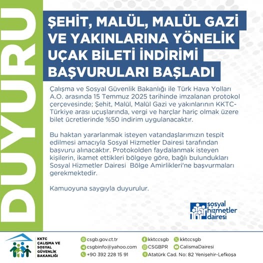 Çalışma ve Sosyal Güvenlik Bakanlığı ile Türk Hava Yolları A.O. arasında 15 Temmuz 2025 tarihinde imzalanan protokol çerçevesinde; Şehit, Malül, Malül Gazi ve yakınlarının KKTC-Türkiye arası uçuşlarında, vergi ve harçlar hariç olmak üzere bilet ücretlerinde %50 indirim uygulanacaktır.