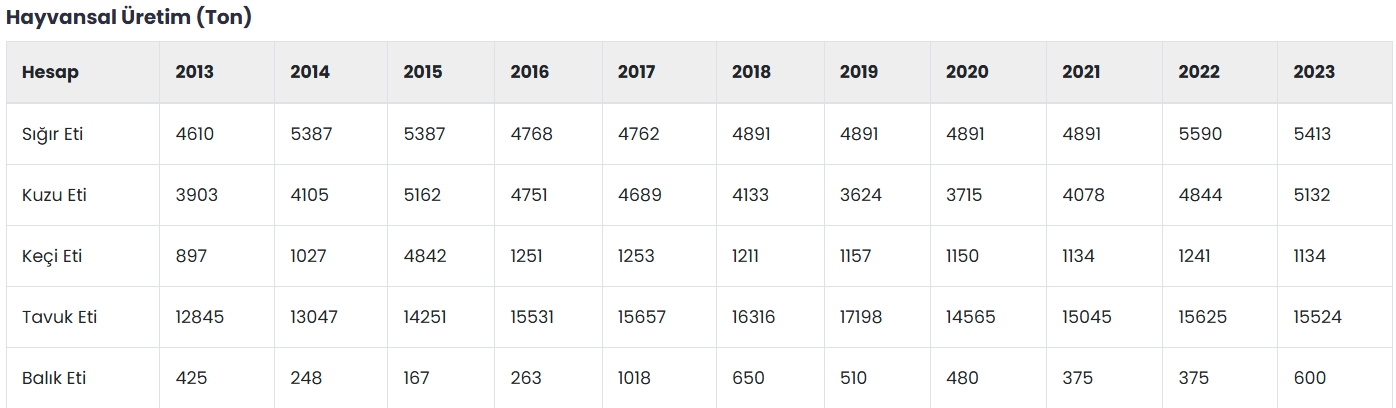 Tavuk etinde belirli bir istikrar söz konusuyken, sık sık zam haberleri ve üretim azlığı nedeniyle gündemi meşgul eden kuzu ve sığır etinde 5 bin tonla düzeyinin aşılamadığı görülüyor. Nüfus artışına bağlı olarak ihtiyaç her geçen yıl arttığı halde kuzu ve sığır üretiminin yıllardır çok fazla artmaması dikkat çekiyor. 2013 yılında 5 bin tona yakın olan sığır üretimi, 10 yıl sonra 5 bin tonun biraz üzerinde seyretti. Kuzu ise 10 yıl içinde yaklaşık bin tonluk bir artışla 4 bin ton civarından 5 bin ton civarına yükseldi. Piyasada pek bir ağırlığı olmayan keçi eti üretiminde de anlamlı bir artış yaşanmadı.