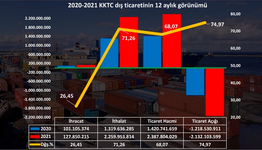 TİCARET HACMİ 2,3 MİLYAR DOLARI AŞTI… Resmi verilere göre KKTC’nin dış ticaret hacmi de rekor seviyeye ulaştı. 2020’de 1 milyar 420 milyon dolar olan dış ticaret hacmi, %68.07 oranında büyümeyle 2 milyar 387 milyon dolara çıktı.