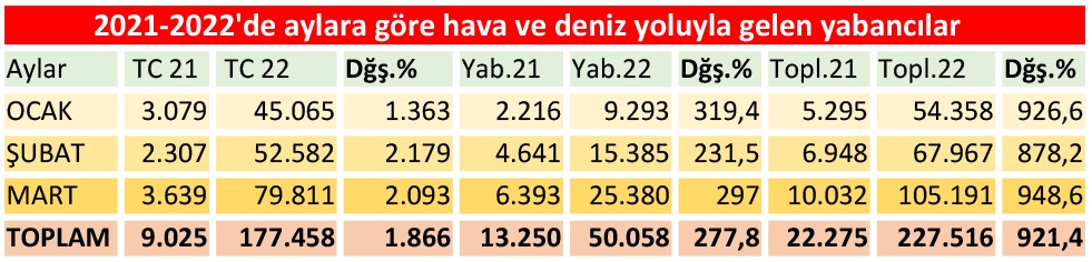Başbakan Yardımcılığı, Turizm, Gençlik, Kültür ve Çevre Bakanlığı’nın 2022 verilerine bakıldığı zaman Ocak ayında 54 bin 358, Şubat ayında 67 bin 967 ve Mart ayında da 105 bin 191 yabancının hava ve deniz yoluyla ülkeye giriş yaptığı görülüyor.