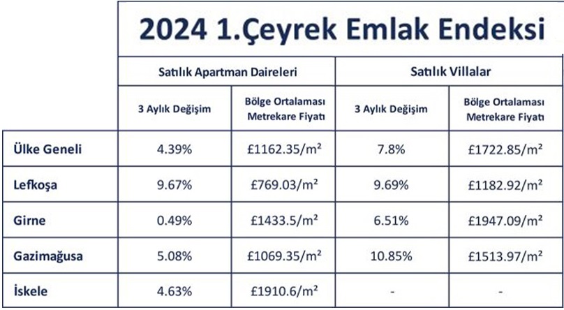 Kuzey Kıbrıs genelinde tüm emlak fiyatları Ocak-Mart 2024 periyodunda ciddi oranlarda artış gösterdi