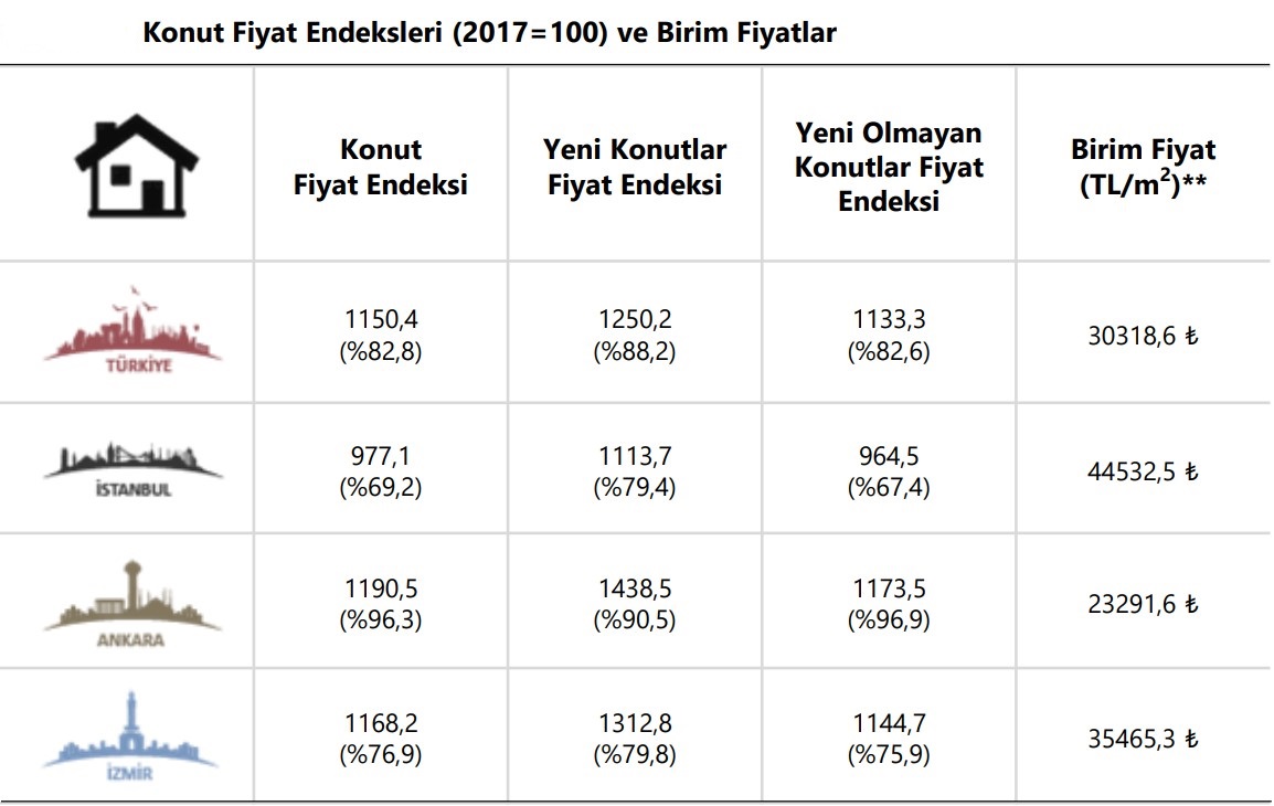 Konut Fiyat Endeksi verilerine göre İstanbul’da bir evin metrekaresi 44 bin 532 liraya yükselirken, fiyat rekoru da yenilendi. Ankara’da ortalama metrekare fiyatı 23 bin 291 TL, İzmir’de de 35 bin 465 TL düzeyinde hesaplandı. Kasım ayında İstanbul’da fiyatlar %0.8; Ankara’da %1.8; İzmir’de de %2.8 oranlarında arttı. Konut fiyat endekslerindeki gelişmeler değerlendirildiğinde, endeks değerleri bir önceki yılın aynı ayına göre, İstanbul’da %69.2; Ankara’da %96.3 ve İzmir’de de %76.9 oranlarında yükseldi.