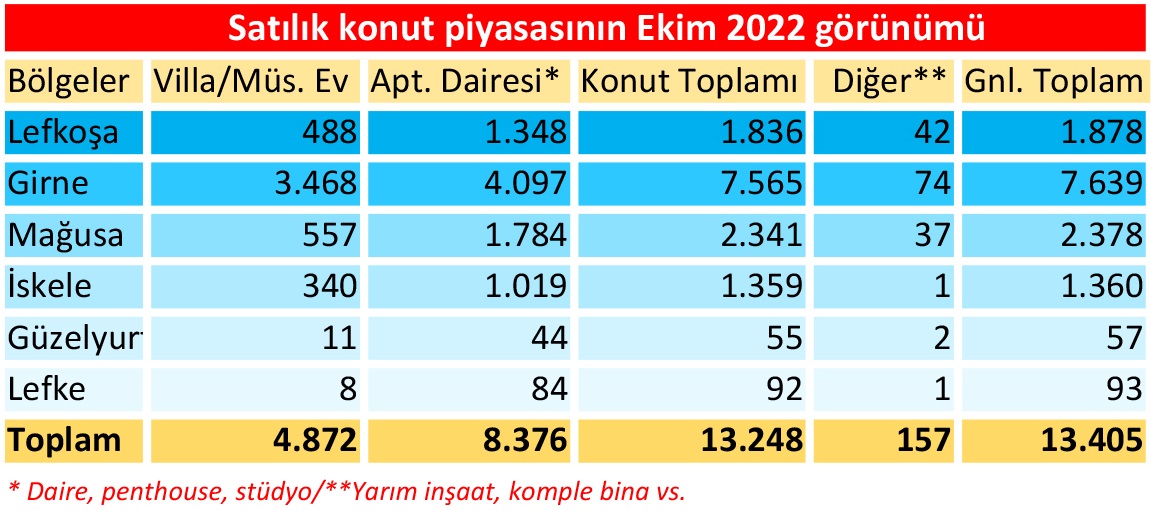 EKİM’DE EN AZ 518 ADET KONUT SATILDI… Veriler, Ekim sonu itibarıyla altı ilçede en az 4 bin 872 adet satılık villa, ikiz villa ve müstakil konut ile en az 8 bin 376 apartman dairesi, stüdyo daire, penthouse bulunduğunu gösteriyor. 101 Evler emlak sitesinden sağlanan bilgilere göre, Eylül ayında satılık müstakil konut (villa, ev) sayısı 4 bin 912, satılık apartman dairesi sayısı da 8 bin 854’tü. Verilere göre satılıktaki toplam konut sayısı %3.76 (518 adet) oranında düştü. Aylık bazda müstakil konut sayısı %0.81 (40 adet) oranında, satılık apartman dairesi sayısı da %5.4 (478 adet) oranında geriledi. Rakamlar ayrıca, Girne ve Girne ilçe sınırları içindeki satılık konut sayısının tüm Kuzey Kıbrıs’taki satılıkların %57.1’ini oluşturduğuna işaret ediyor.