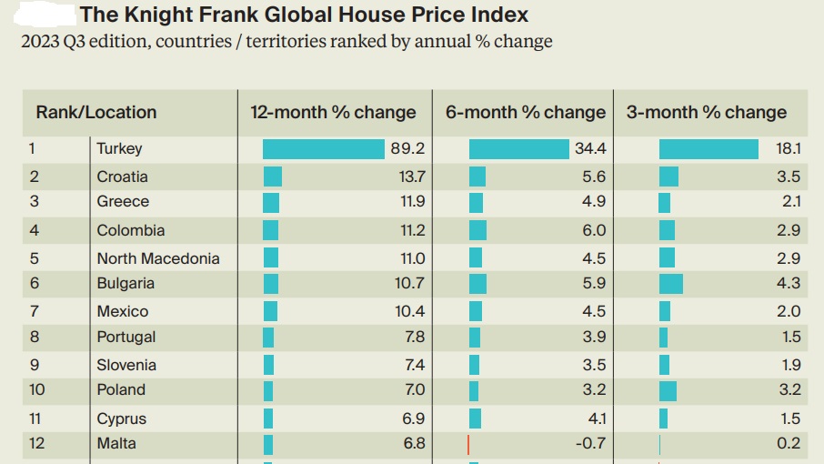 Güney Kıbrıs ise Knight Frank Küresel Konut Fiyatları Endeksi’nde (2023-Q3) 11’nci sırada yer aldı. Eylül 2023 itibarıyla Güney’deki konut fiyatları yıllık bazda %6.9 oranında artış yaşarken, 6 aylık artış oranı %4.1 düzeyinde; üç aylık artış oranı da %1.5 düzeyinde hesaplandı. Araştırmaya göre, 56 ülke ve bölgenin 35’inde fiyat artışı görülürken, 21 ülkede ise fiyat düşüşü yaşandı. Konut fiyatlarının en çok arttığı 10 ülkede yıllık artış %13 ve 7 arasında değişirken, Türkiye’nin ardından fiyatların en çok yükseldiği ülke %13.7 ile Hırvatistan oldu. Bu ülkeyi %11.9 ile Yunanistan takip etti. 2023 üçüncü çeyrek itibariyle son bir yılda konut fiyatlarının dünya genelinde en çok gerilediği ülke ise %11.7’lik düşüşle İsveç oldu. Slovakya’da %10.1, Finlandiya da ise %9.6 gerileme oldu.