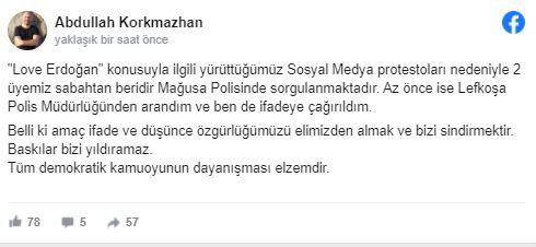 Korkmazhan, bir önceki açıklamasında, “Love Erdoğan konusuyla ilgili yürüttüğümüz Sosyal Medya protestoları nedeniyle 2 üyemiz sabahtan beridir Mağusa Polisinde sorgulanmaktadır. Az önce ise Lefkoşa Polis Müdürlüğünden arandım ve ben de ifadeye çağırıldım. Belli ki amaç ifade ve düşünce özgürlüğümüzü elimizden almak ve bizi sindirmektir. Baskılar bizi yıldıramaz. Tüm demokratik kamuoyunun dayanışması elzemdir” demişti.