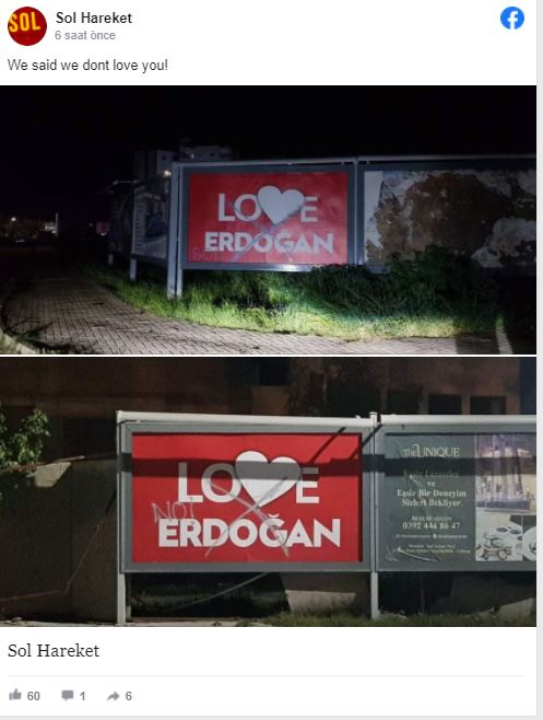 Lefkoşa’daki iki afişe yönelik yapılan karalama, Sol Hareket’in resmi sosyal medya hesapları üzerinden paylaşılmıştı.