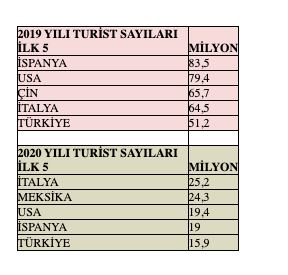 83.5 milyon turist ile 2019 yılının 1.’si olan İspanya, 2020 yılında 19 milyon turist ile 4. sıraya inerken; 2019 yılının 3.’sü olan Çin, aldığı radikal tedbirlerle turist sayısını neredeyse sıfırlayarak, adeta dünya turizminden silindi.