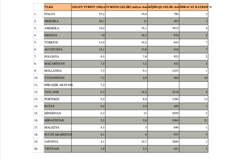 En çok turist getiren 20 ülke içinde kişi başı gelirde Türkiye 17. sırada yer alıyor.  Yukarıdaki tabloda göreceğiniz gibi en çok turist getiren ilk 20 ülke içinde sadece Meksika, Macaristan ve Rusya’nın kişi başı turizm geliri bizden düşük.