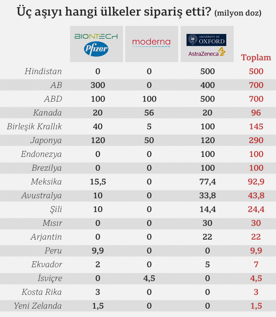 Türkiye’nin aşı konusunda önde gelen bu üç şirketten (AstraZeneca, Pfizer ve Moderna) kesinleşmiş bir siparişi yok.