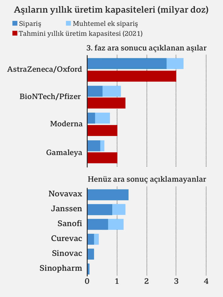 AstraZeneca, Pfizer ve Moderna’nın 2021 sonuna kadar 2,6 ile 3,1 milyar kişiye yetecek kadar aşı üretebileceği, Rusya’daki Gamaleya’nın da 500 milyon kişi için aşı üretebileceği düşünülüyor.