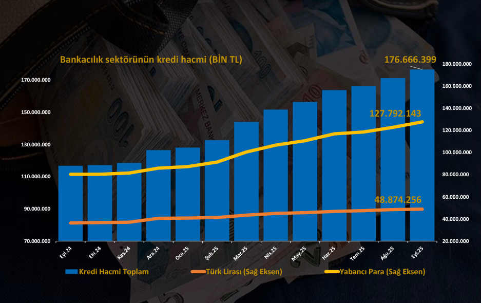Bankacılık sektörü verileri, krediler içinde dövizin payının yükselmeye devam ettiğini gösteriyor. Eylül 2025 itibarıyla net kredilerin 48 milyar 875 milyon TL’sinin (%27.6) Türk Parası (TP) cinsinden; 127 milyar 792 milyon TL’sinin (%72.3) de Yabancı para (YP) cinsinden alındığı kayıtlara geçti. Yılın dokuz aylık döneminde, Türk Lirası kredilerde %20.3; döviz cinsinden kredilerde %48.7 artış hesaplandı.