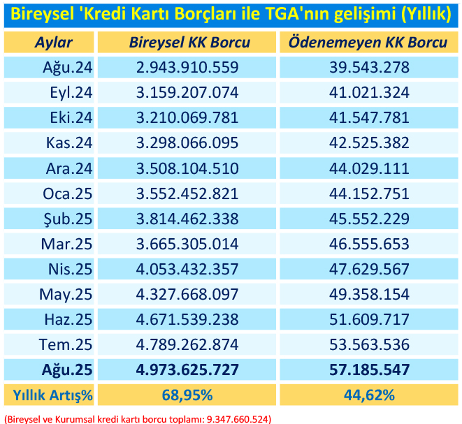 Merkez Bankası verileri, bireysel (vatandaşın) kredi kartı borçlarının Ağustos 2024 ile Ağustos 2025 arasındaki yıllık dönemde %68.95 oranında; Aralık sonundan Ağustos sonuna kadarki sekiz aylık sürede ise %41.78 oranında büyüdüğünü gösteriyor. Bireysel kredi kartı borçları geçen yılın sekizinci ayında 2 milyar 658 milyon lira, son ayında da 3 milyar 508 milyon TL düzeyindeydi. Ayrıca, Ağustos 2025 sonundaki 4,9 milyarlık kredi kartı borcu; tüm zamanların en yüksek seviyesi olarak kayıtlara geçti.