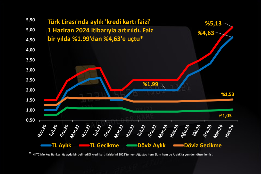 KKTC Merkez Bankası Haziran ayı başından geçerli olacak şekilde kredi kartı faiz oranlarını hem Türk Lirası cinsi işlemlerde hem de döviz cinsi işlemlerde ciddi oranda artırdı. Geçen yıl üç aylık sürelerde yaptığı değişiklikle 5 kez faiz artışına giden Merkez Bankası, 2024’ün ikinci faiz değerlendirme dönemini de boş geçmedi. Kredi kartında TL işlemler için yapılan astronomik oranlı faiz artışı dikkati çekti. Zamlanan faizler için ilk ödeme Temmuz ayının ilk günlerinde belirlenen ekstrelerle yapılacak. Bozulan ekonomi ve aşırı pahalılık nedeniyle hem vatandaşlar hem de şirketler harcamalarında kartlara yüklenirken, 2024’ün Nisan ayı itibarıyla kredi kartı borçları 4 milyar 197 milyon TL’yi aştı.
