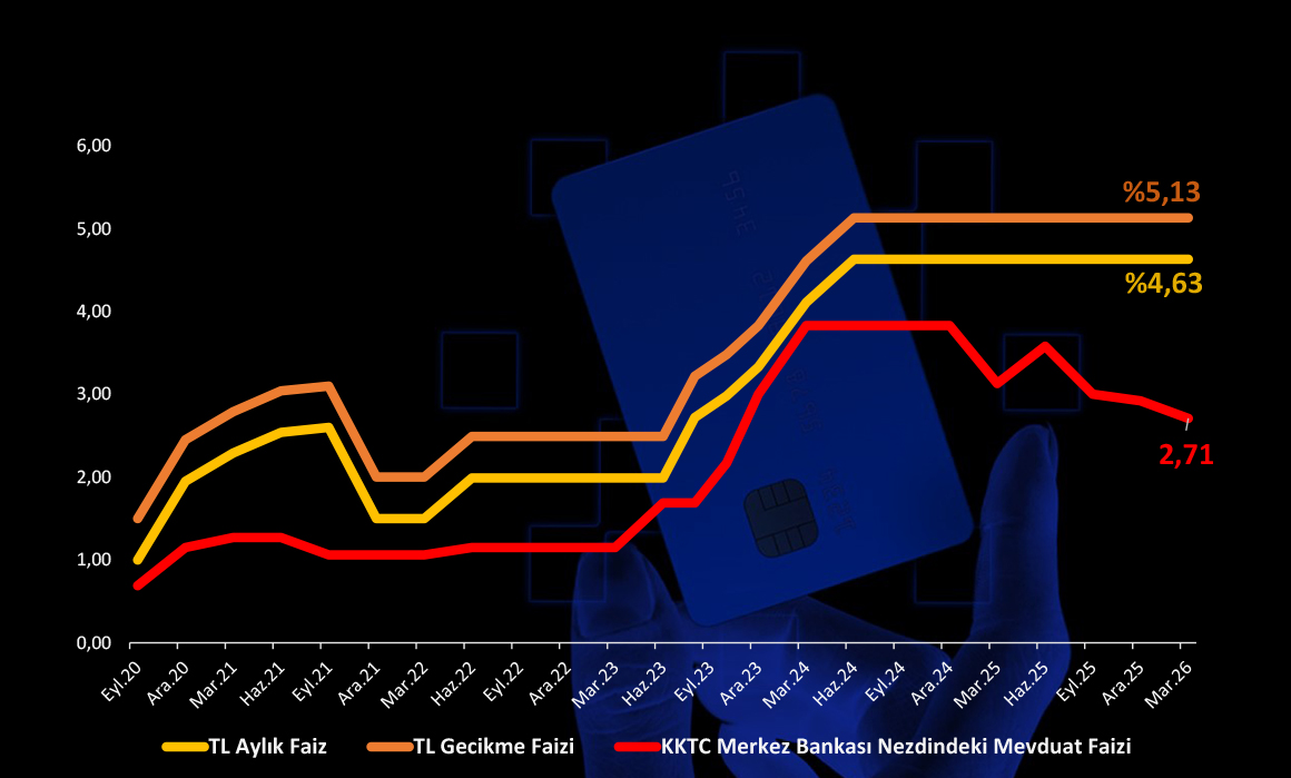 KKTC Merkez’in düzenlediği son DİBS (iç borç) ihalesinde TL cinsinden alınan kredinin faiz oranı (aylık %3) ile kredi kartı faizleri arasında da derin uçurum var. Merkez Bankası’nın uyguladığı faizler ülkede faaliyette olan bankalarının faiz politikalarını da belirliyor. Öte yandan, Aralık 2025 verilerine göre kartlardaki toplam borç 10,6 milyar lira, mahkemelik borçlar (TGA) ise 80 milyon lira civarında.