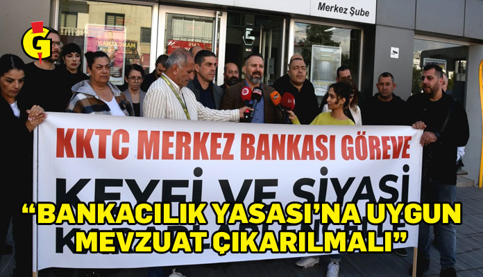 Basın açıklamasında, “KKTC Merkez Bankası Göreve, Keyfi ve Siyasi Kararları Engelle” yazılı pankart açıldı.