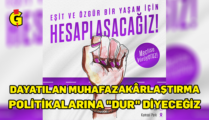 “Toplumumuzun çağdaş, laik ve demokratik yapısına yönelik saldırılara karşı direnen örgütler ve bireyler olarak, bizlere dayatılan muhafazakârlaştırma politikalarına “DUR” demek için bazı siyasi partiler ve sivil toplum örgütleri olarak başlattığımız mücadeleye 8 Mart Dünya Emekçi Kadınlar Günü’nde de devam ediyoruz” ifadeleri kullanıldı.