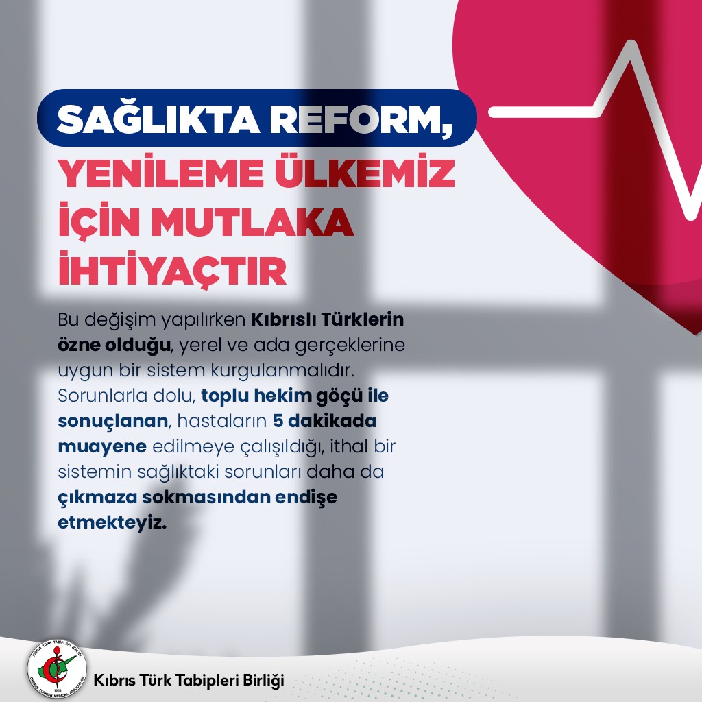 Sağlıkta reform, yenileme veya dönüşüm ülkemiz için mutlaka gerekli, elzem ve ihtiyaçtır. Bu değişim yapılırken Kıbrıslı Türklerin özne olduğu, yerel ve ada gerçeklerine uygun bir sistem kurgulanmalıdır. Sorunlarla dolu, toplu hekim göçü ile sonuçlanan, hastaların 5 dakikada muayene edilmeye çalışıldığı, ithal bir sistemin sağlıktaki sorunları daha da çıkmaza sokmasından endişe etmekteyiz.