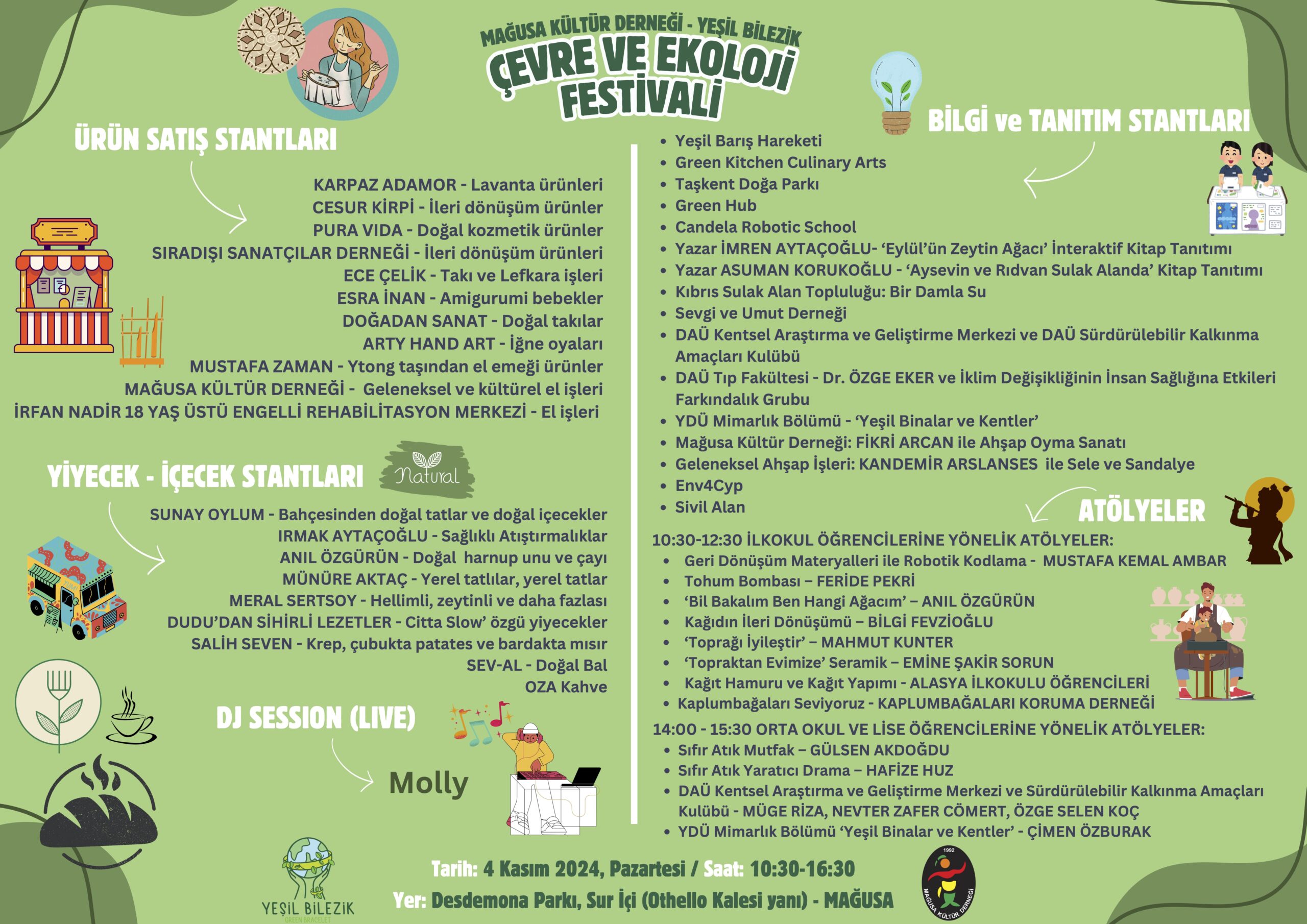 Avrupa Birliği’nin Kıbrıslı Sivil Toplum İş Başında VII Hibe Programı kapsamında finanse edilen ve Mağusa Kültür Derneği tarafından yürütülen Yeşil Bilezik: Sürdürülebilir Kalkınma için Çevre Okuryazarlığı projesinin kapanış etkinliği olan Çevre ve Ekoloji Festivali 4 Kasım 2024 tarihinde, 10.30-16.30 saatleri arasında Mağusa Suriçi Desdemona Parkı’nda gerçekleştirilecek.