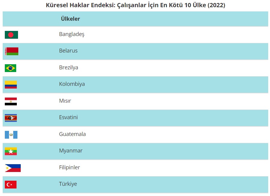 Uluslararası Sendikalar Konfederasyonu’nun (ITUC) 148 ülkeyi kapsayan Küresel Haklar Endeksi’ne göre Türkiye 2022 yılında çalışanlar için en kötü 10 ülkeden birisi. Değerlendirme işçi haklarına göre yapılıyor.