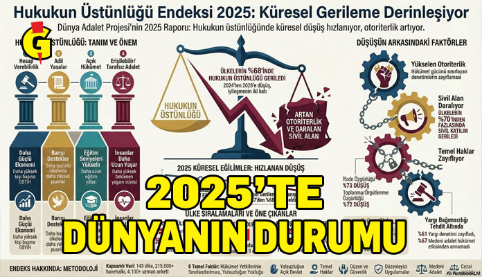 2025 yılının son günlerinde açıklanan küresel veriler, dünyanın otoriterleşme ve ekonomik belirsizlik kıskacında bir yılı geride bıraktığını gösteriyor. World Justice Project (WJP) tarafından hazırlanan 2025 Hukukun Üstünlüğü Endeksi, küresel çapta hukukun üstünlüğündeki gerilemenin üst üste sekizinci yılında da devam ettiğini ortaya koyarak, temel haklar ve yargı bağımsızlığı konularında alarm veriyor.
