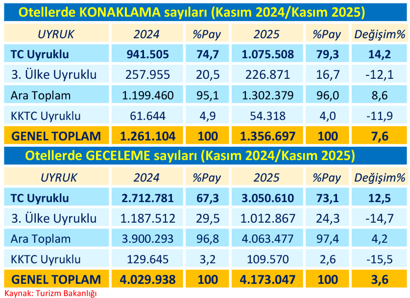 Turizm Bakanlığı’nın 2025 yılı Ocak-Kasım verileri, sektörün büyüme dinamiklerindeki ciddi eksen kayması olduğunu bir kez daha ortaya koydu. 11 aylık periyotta otellerde konaklayan kişi sayısı 1 milyon 302 bin 379 kişi olarak açıklandı. “Yerli turistlerle” bu sayı 1 milyon 356 bin 697 kişiye çıkıyor. Toplam konaklama sayısı geçen yıla kıyasla %7.6 artsa da sektörün neredeyse tamamının tek bir kaynağa (Türkiye) bağımlı hale gelmesi, “sürdürülebilir turizm” tartışmalarını alevlendirdi.