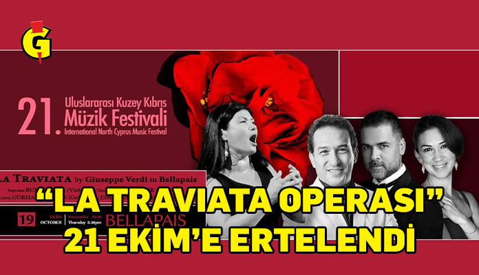 Kuzey Kıbrıs Müzik Derneği’nin organizasyonunda bu yıl 21’incisi düzenlenen Uluslararası Kuzey Kıbrıs Müzik Festivali çerçevesinde bu akşam Bellapais Manastırı’nda yer alacak olan La Traviata Operası, “ulusal yas” nedeniyle 21 Ekim Cumartesi akşamına ertelendi.
