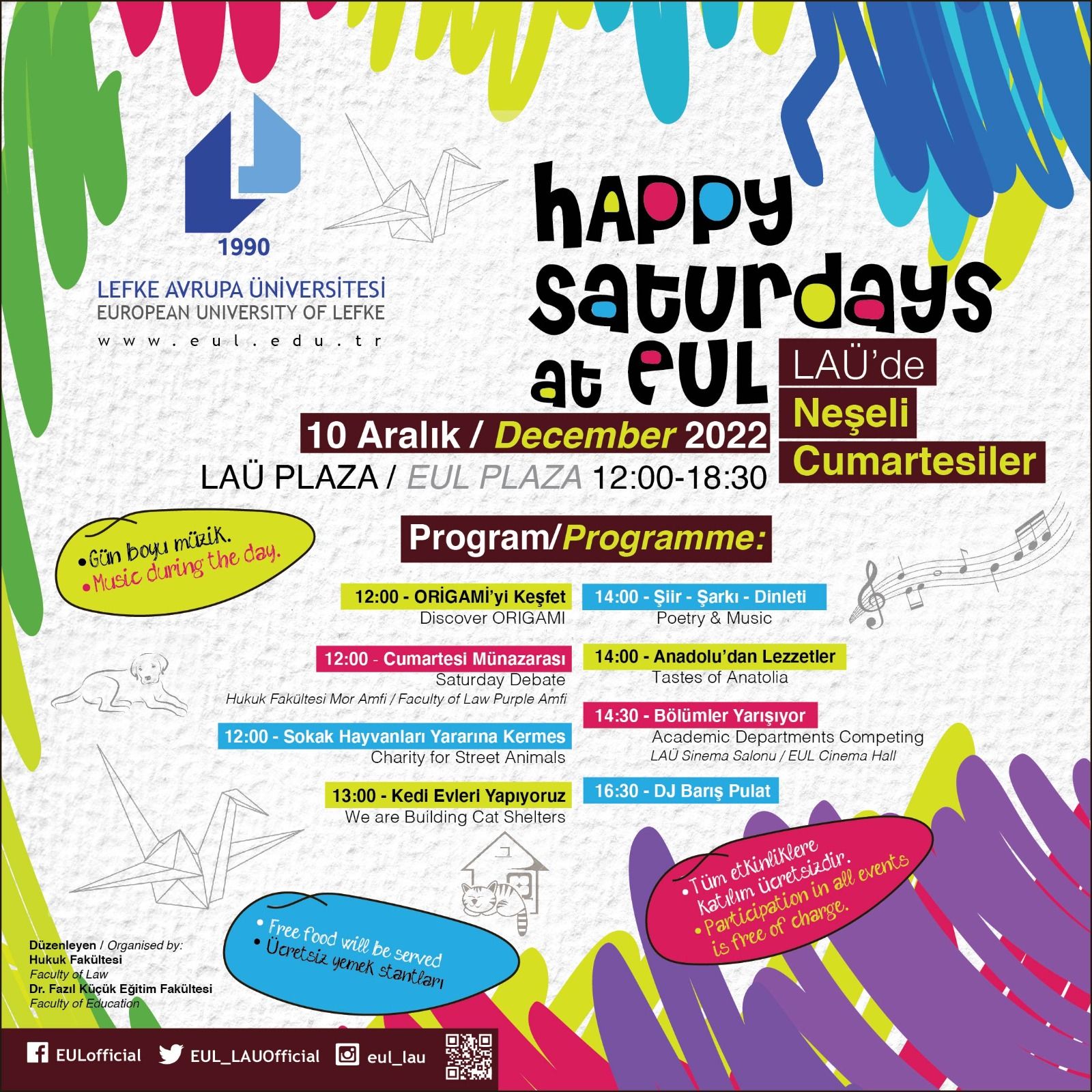 LAÜ kampüsünde düzenlenen Neşeli Cumartesiler etkinlik serisinin ikincisi Hukuk Fakültesi ve Dr. Fazıl Küçük Eğitim Fakültesi’nin katkılarıyla 10 Aralık 2022 Cumartesi günü gerçekleşecek.