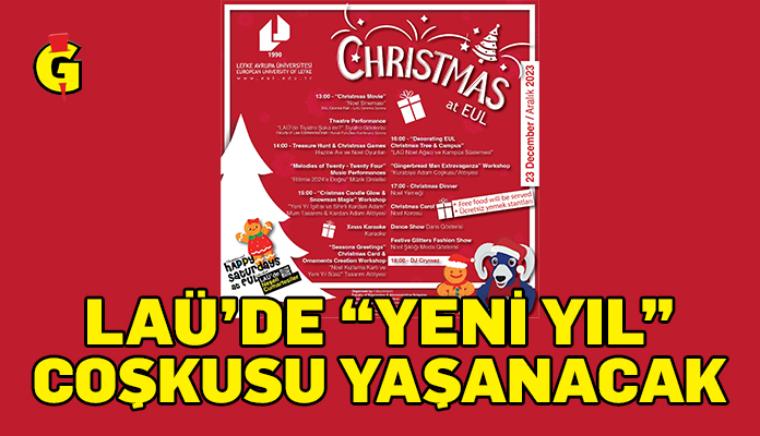 Gün boyu müzik ile ücretsiz yemek standlarının yer alacağı ve LAÜ öğrencilerinin katılımıyla gerçekleşecek etkinlikler Noel Sineması ile saat 13:00’de başlayacak. Yeni yıl etkinlik programında; LAÜ’de Tiyatro Şaka mı? Gösterisi, Hazine Avı ve Moel Oyunları, “Ritimle 2024’e Doğru” Müzik Dinletisi, “ Yeni Yıl Işıltısı ve Sihirli Kardan Adam” Mum ve Tasarım Atölyesi, “Noel Kutlama Kartı Atölyesi”, “Kurabiye Adam Çoşkusu Atölyesi” Noel Yemeği , Noel Korosu, Dans Göstersi, Noel Şıklığı Moda Gösterisi, Karaoke ve DJ Crymez’in performası ile öğrenciler doyasıya eğlenecekler.