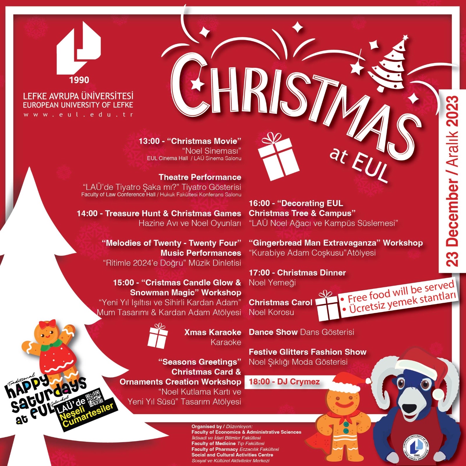 Gün boyu müzik ile ücretsiz yemek standlarının yer alacağı ve LAÜ öğrencilerinin katılımıyla gerçekleşecek etkinlikler Noel Sineması ile saat 13:00’de başlayacak. Yeni yıl etkinlik programında; LAÜ’de Tiyatro Şaka mı? Gösterisi, Hazine Avı ve Moel Oyunları, “Ritimle 2024’e Doğru” Müzik Dinletisi, “ Yeni Yıl Işıltısı ve Sihirli Kardan Adam” Mum ve Tasarım Atölyesi, “Noel Kutlama Kartı Atölyesi”, “Kurabiye Adam Çoşkusu Atölyesi” Noel Yemeği , Noel Korosu, Dans Göstersi, Noel Şıklığı Moda Gösterisi, Karaoke ve DJ Crymez’in performası ile öğrenciler doyasıya eğlenecekler.