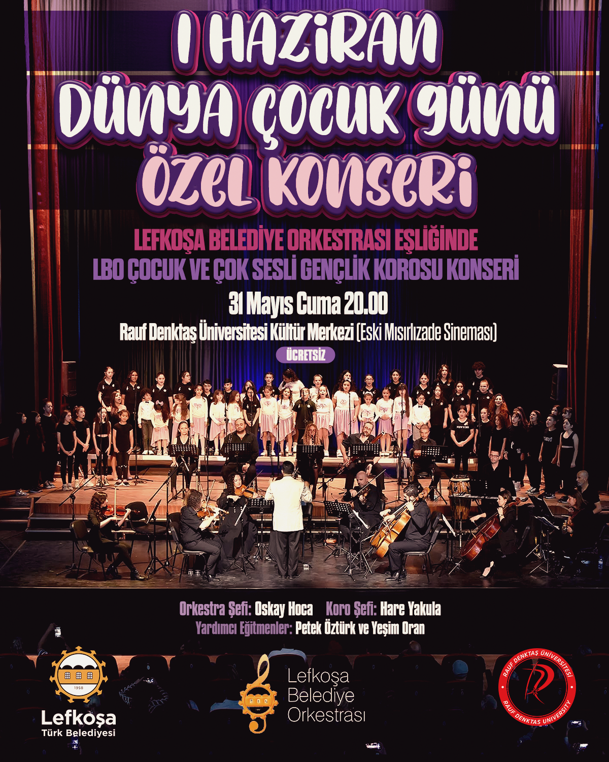 Orkestra Şefliğini Oskay Hoca’nın, Koro Şefliğini Hare Yakula‘nın üstlendiği bu özel konser, 31 Mayıs Cuma saat 20.00’de Rauf Denktaş Üniversitesi Kültür Merkezi’nde (Eski Mısırlızade Sinema) gerçekleştirilecek. Yardımcı eğitmenliğini Petek Öztürk ve Yeşim Oran’ın yaptığı koro, Lefkoşa Belediye Orkestrası ile aynı sahneyi paylaşacağı bu konserde Minikler Korosu, Yıldızlar Korosu ve Çok Sesli Gençlik Korosu, klasik çocuk ezgileri, çok sesli düzenlemeler ve Kıbrıs şarkılarından oluşan zengin bir repertuar ile muhteşem bir geceye imza atmaya hazırlanıyor. Birbirinden güzel şarkıların seslendirileceği konserde “Çocuklar Barışla Doğsun” ve “Vapurum Üç Borulu” şarkılarını finalde tüm korolar hep beraber seslendirecek.