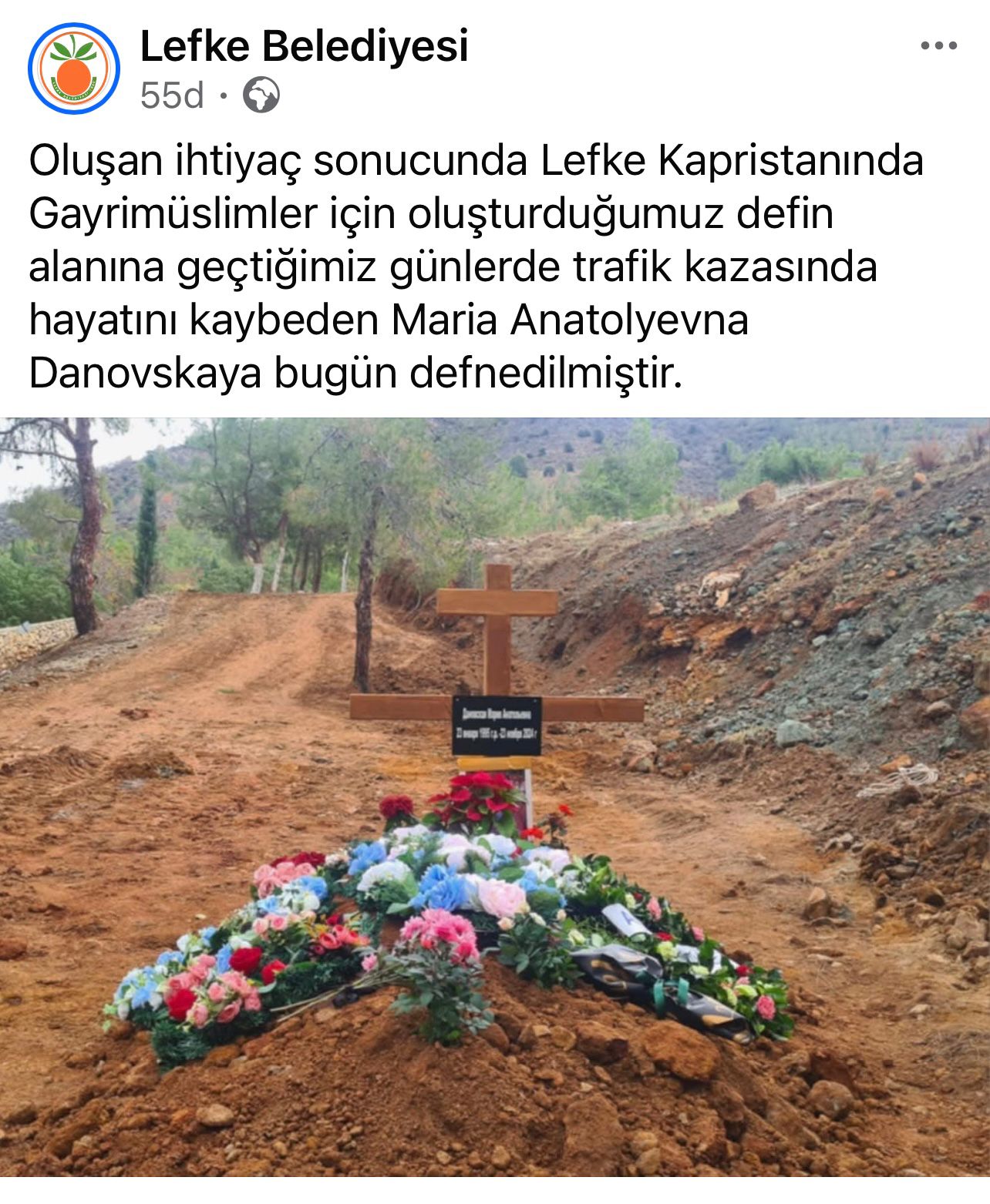 Lefke Belediyesi’nden yapılan paylaşımda, “Oluşan ihtiyaç sonucunda Lefke Kapristanında Gayrimüslimler için oluşturduğumuz defin alanına, geçtiğimiz günlerde trafik kazasında hayatını kaybeden Maria Anatolyevna Danovskaya bugün defnedilmiştir.” denildi