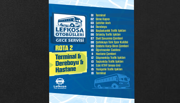 Lefkoşa Otobüsleri Gece Servisi’nin Terminal-Dereboyu ve Hastaneden oluşan ikinci rotası ise şöyle: