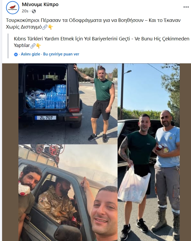 Güney Kıbrıs’taki önemli sosyal medya platformlarından birisi olan “menoumekypro” Limasol’daki yangın bölgesine gönüllü yardım taşıyan Kıbrıslı Türklerle ilgili bir paylaşım yaptı.