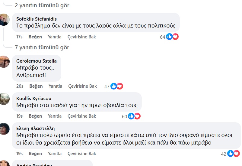 Binden fazla Kıbrıslı Rum paylaşımın altında yorum yaptı. Yorumcuların çok büyük kısmı yardıma koşan Kıbrıslı Türklere teşekkür etti.