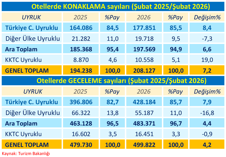 Resmi verilere göre, otellerde konaklayanların %85.5’i Türkiye Cumhuriyeti uyruklu; %9.5’i “Diğer” ülke uyruklu ve %5.1’i de KKTC uyruklu olarak kayıtlara geçti. 2026’nın ilk iki ayında otellerde konaklayan TC uyruklu sayısı, 2025’in aynı dönemine kıyasla %8.4 oranında artışla 164 bin 086 kişiden, 177 bin 851 kişiye çıktı. Üçüncü ülke uyruklu (diğer ülkeler) turist sayısı ise %7.4 düşüşle 21 bin 282 kişiden, 19 bin 718 kişiye indi. Döviz harcayan yabancı turistlerdeki kayıp her ay biraz daha derinleşiyor. KKTC uyruklularda %19 oranında artış olurken, yerli turist sayısı 10 bin 558 kişiye çıktı.