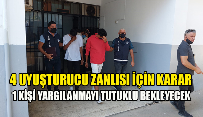 Huzurundaki şahadeti değerlendiren yargıç Mine Gündüz, ileride görülecek davalarında bulunmalarını temin etmek maksadıyla zanlı 1’ i 45 günü aşmamak kaydıyla hükümsüz tutuklu olarak Gazimağusa polis müdürlüğüne bağlı bir karakola gönderilmesi emrini verirken, zanlı 2, zanlı 3 ve zanlı 4’ ün de KKTC haricine çıkışlarını men ederek 15 biner TL nakdi teminat yatırmaları, KKTC vatandaşı muteber birer kefilin 75 biner TL şahsi kefalet senedi imzalamaları ve haftada 1 gün polise ispat-ı vücut etmeleri şartıyla serbest kalmaları yönünde emir verdi.