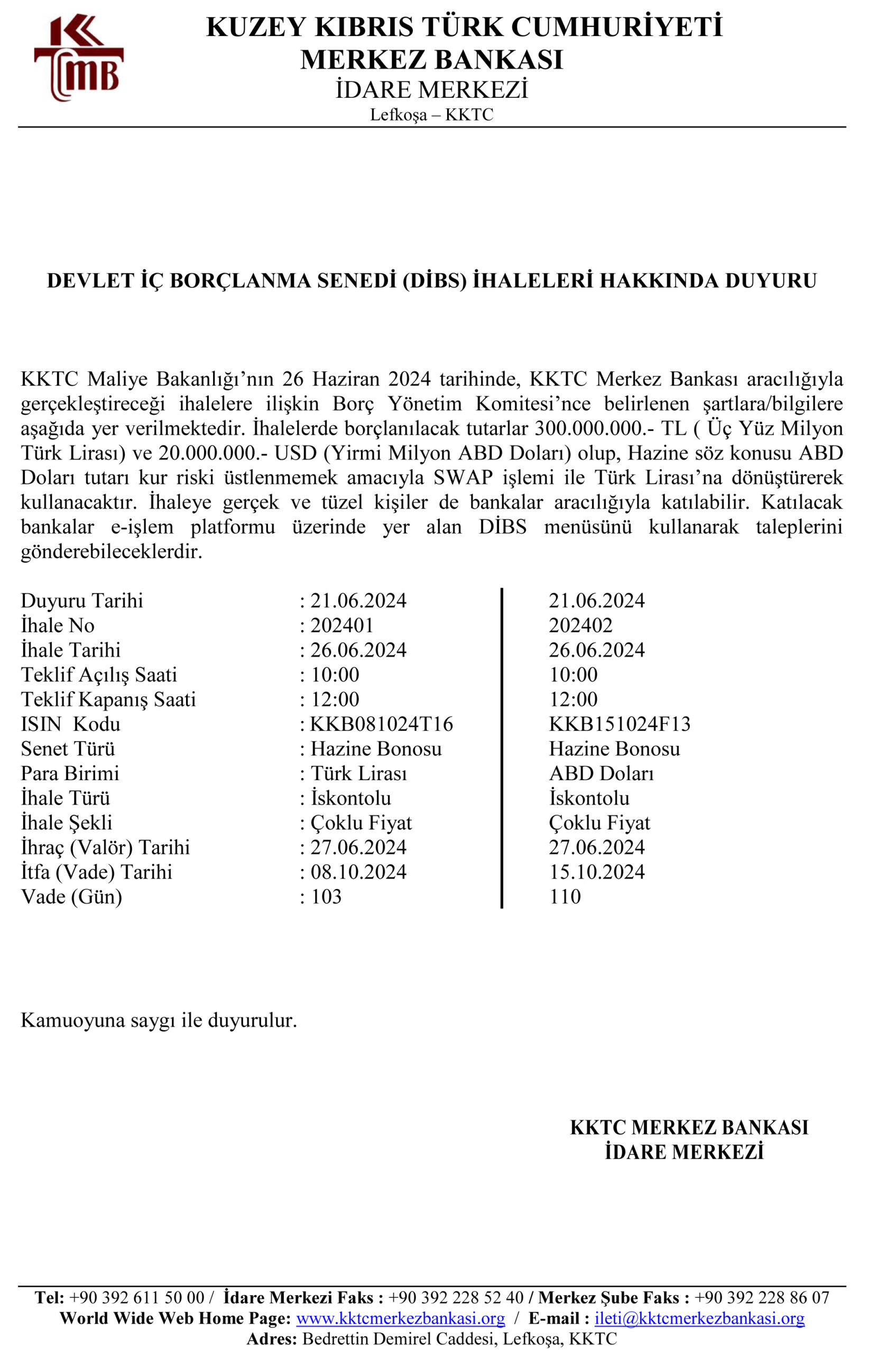 Mevduattaki dövize kaçış, iç borçlanmayı da dövize çevirirken, Maliye Bakanlığı için 20 milyon ABD Doları ve 300 milyon TL tutarında iki ayrı iç borç ihalesi açıldı. KKTC Merkez Bankası aracılığıyla açılan ihaleler 26 Haziran 2024 Çarşamba günü sonuçlandırılacak. Geçtiğimiz Cuma günkü döviz kurlarına göre aranan dolar borcun TL karşılığı 657 milyon TL civarında. Bu miktar, Türk parası cinsinden aranan 300 milyon TL miktarla birlikte 957 milyon TL’ye ulaşıyor. Alınacak borcun faizleriyle birlikte geri ödemesi sonrasında ise maliyetin 1 milyar TL’yi aşacağı hesaplanıyor.