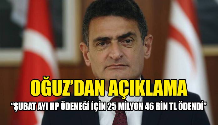 Maliye Bakanı Dursun Oğuz, dondurulan Hayat Pahalılığı ödeneğinin şubat ayına ait kısmı için 25 milyon 64 bin TL ödendiğini açıkladı.