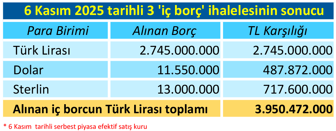 KKTC Merkez Bankası’nın Maliye Bakanlığı’na kaynak sağlamak amacıyla çıktığı Türk Lirası, ABD Doları ve İngiliz Sterlini cinsinden iç borç ihalesi dün sonuçlandı. “Üç” ayrı Devlet İç Borçlanma Senedi (DİBS/Hazine bonosu ihracı) ihalesinde 3 milyar 950 milyon Türk Lirası’nın üzerinde borç alındı. Yeni borçlanmalarla birlikte, 11 Şubat ile 6 Kasım 2025 arasındaki yaklaşık dokuz aylık sürede Maliye 33 kez borçlanmaya giderken, alınan iç borç toplamı 27 milyar 020 milyon liraya ulaştı. Bakanlar Kurulu, 4 Şubat’ta, “Devletin mali yükümlülüklerinin yerine getirilmesine olanak sağlamak amacıyla, 2025 Mali Yılı Bütçe Yasası limitleri dahilinde 6 milyar TL borçlanma kararı” almış, Maliye Bakanlığı yetkili kılınmıştı.
