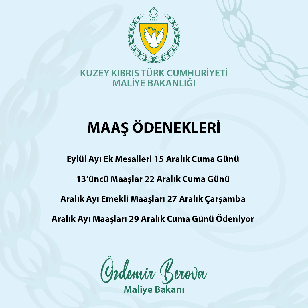 “Eylül ayı ek mesaileri 15 Aralık Cuma, 13’üncü maaşlar 22 Aralık Cuma, Aralık ayı emekli maaşları 27 Aralık Çarşamba ve Aralık ayı maaşları ise 29 Aralık Cuma günü ödeniyor.”