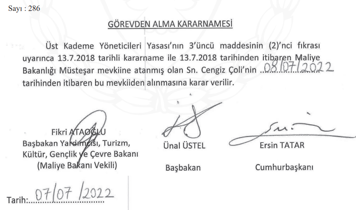 Maliye Bakanlığı Müsteşarı Cengiz Çoli ve Maliye Bakanlığı Bakanlık Müdürü Ersan Karataş’ın görevden alınmaları resmileşti.