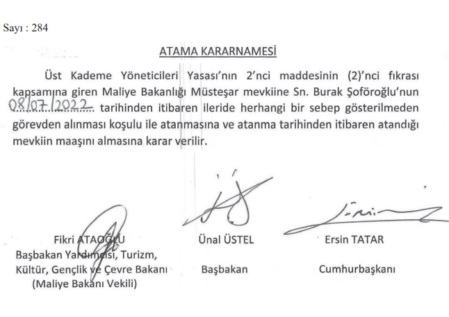 Üçlü kararname ile alınan kararların altında Cumhurbaşkanı Ersin Tatar ve Başbakan Ünal Üstel’le birlikte, Maliye Bakanlığı’na vekalet eden Başbakan Yardımcısı, Turizm, Kültür, Gençlik ve Çevre Bakanı Fikri Ataoğlu’nun imzası yer aldı.